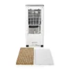 The air cooler works as follows: it pulls in dry, hot air which is passed through a moistened pad, this pad absorbs the heat and the moisture in the pad evaporates, cooling the air with a few degrees for you to enjoy an invigorating, refreshing breeze. Compare it to spending a hot summer day on the water: even though temperatures are high, it still feels pleasantly cool.