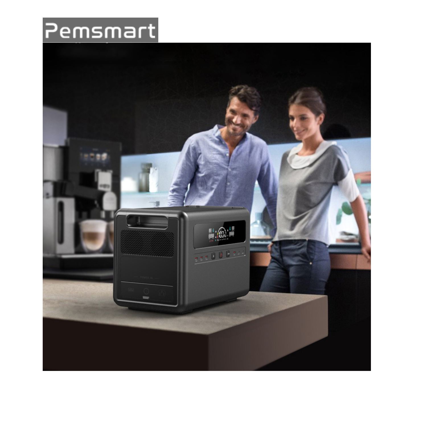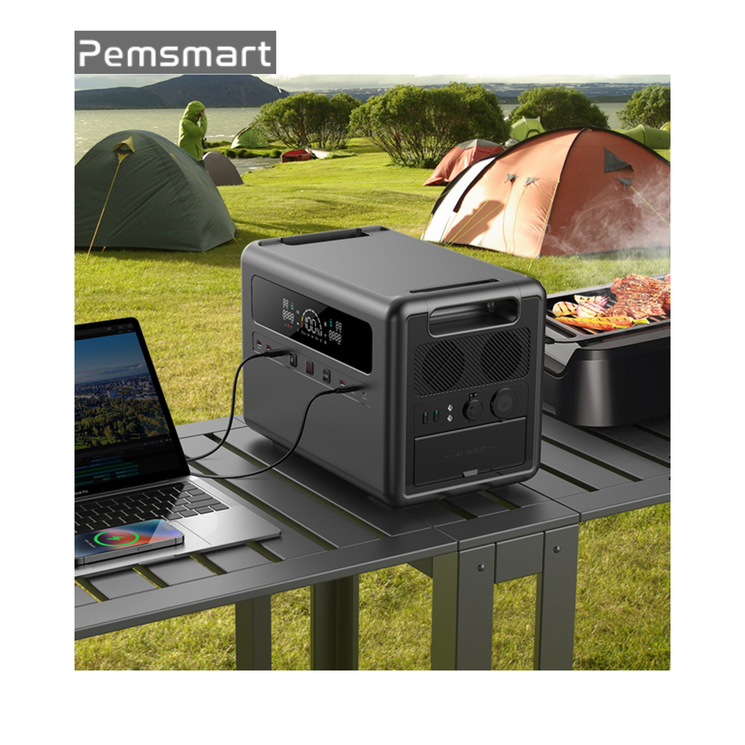 Pemsmart Q2400 2304Wh portable power station with 2400W pure sine wave, LiFePO4 battery, UPS function, fast AC charging, and 800W solar input. Ideal for backup and off-grid power.