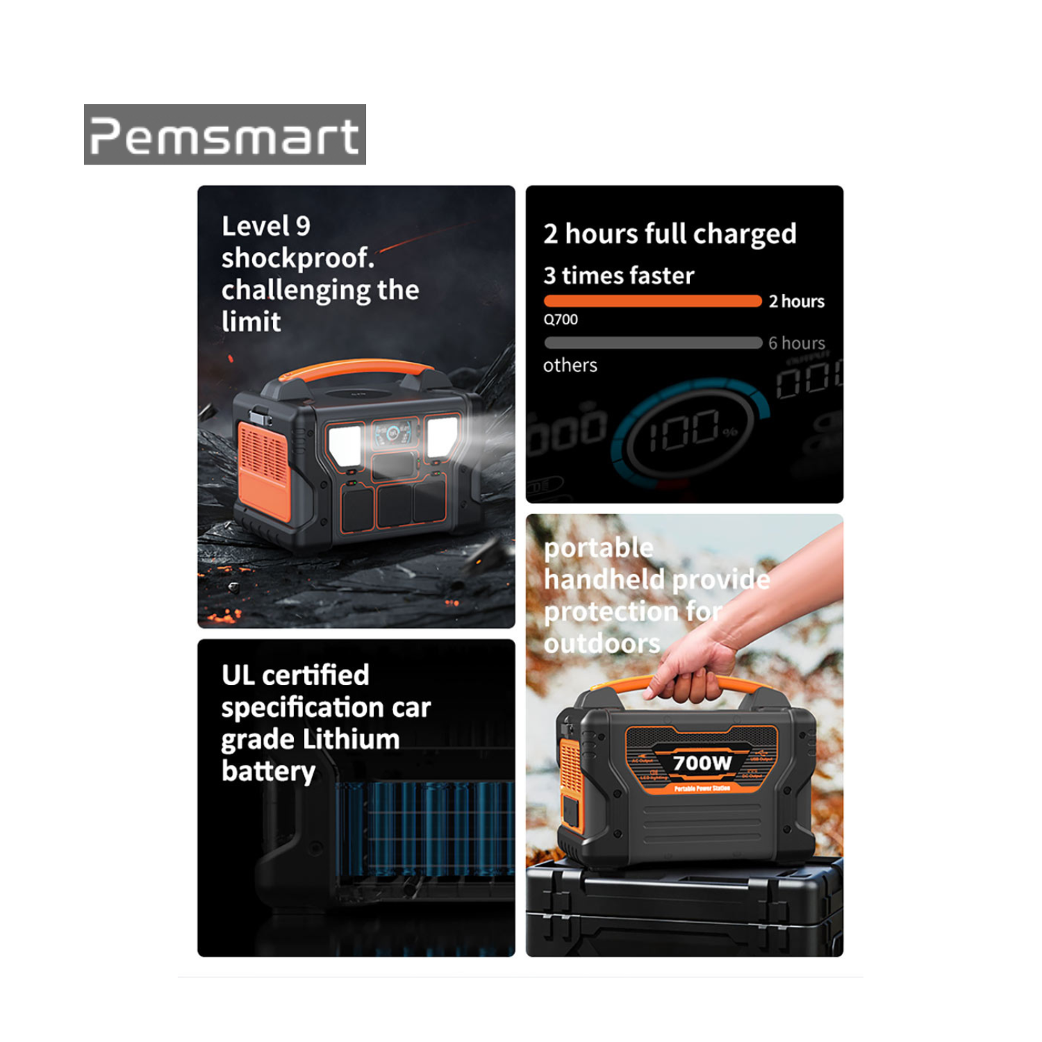 The Pemsmart Q700 combines pure sine wave output, long-life LiFePO4 battery, UPS functionality, and versatile charging options—making it a dependable and efficient portable power solution for any situation.