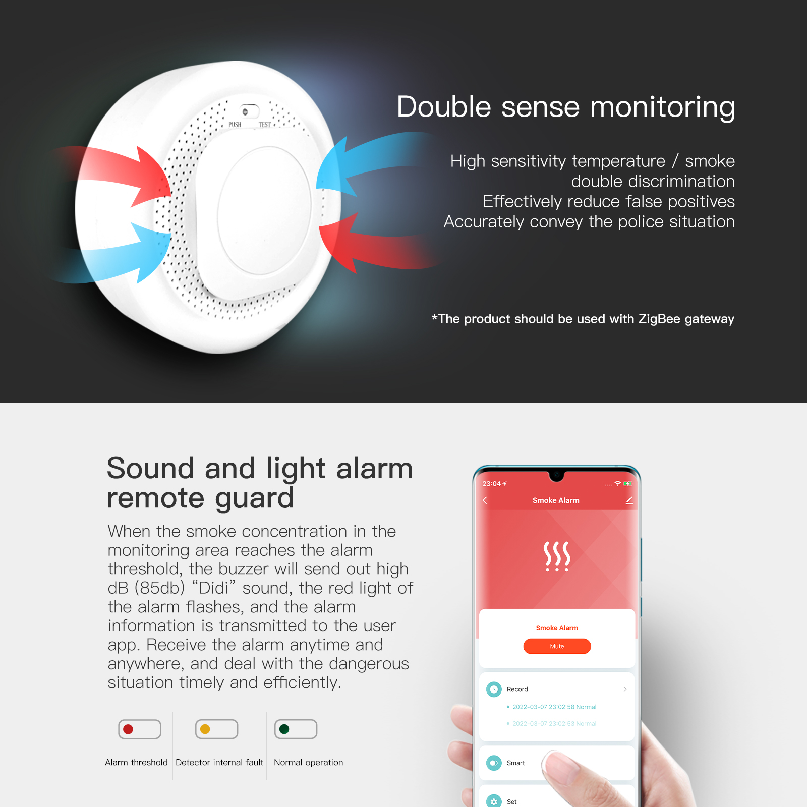 • App Push Notifications and Control: Compatible with MOES and Tuya App enables the timely discovery of danger of fire or smoke and real- time notifications to your smart phone.No need to be connected to the alarm host that is able to work independently with ZigBee hub connected for informing alarm situation. And even low battery indication in smart phone App.